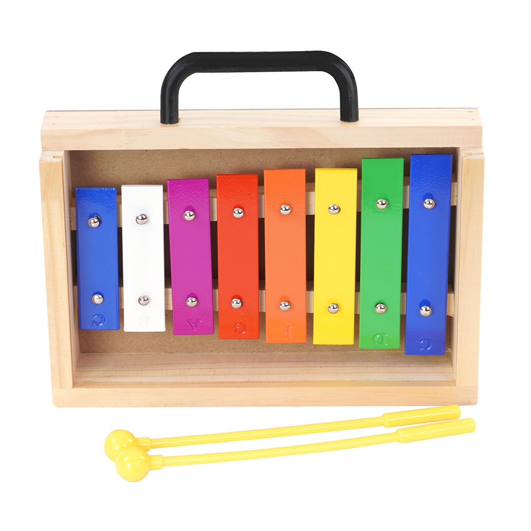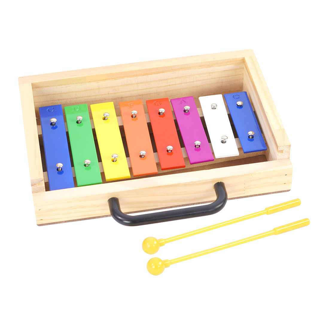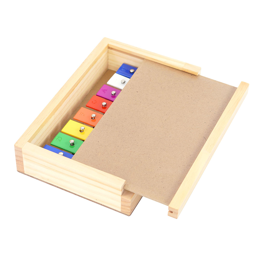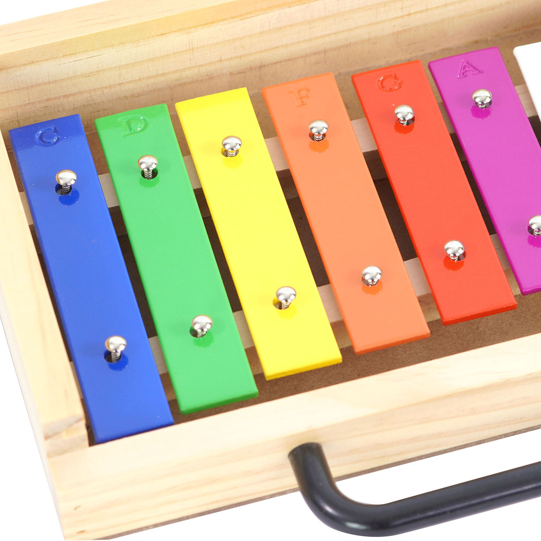 El Metalófono de 8 notas de colores con caja de madera es fundamental y básico para niños y jóvenes que dan sus primeros pasos en el aprendizaje de música. Ampliamente usado por profesores como herramienta de enseñanza, ya que este Instrumento de percusión a base de placas de metal que al ser golpeadas producen un sonido, según el tamaño de la placa el sonido o nota generada será distinta.