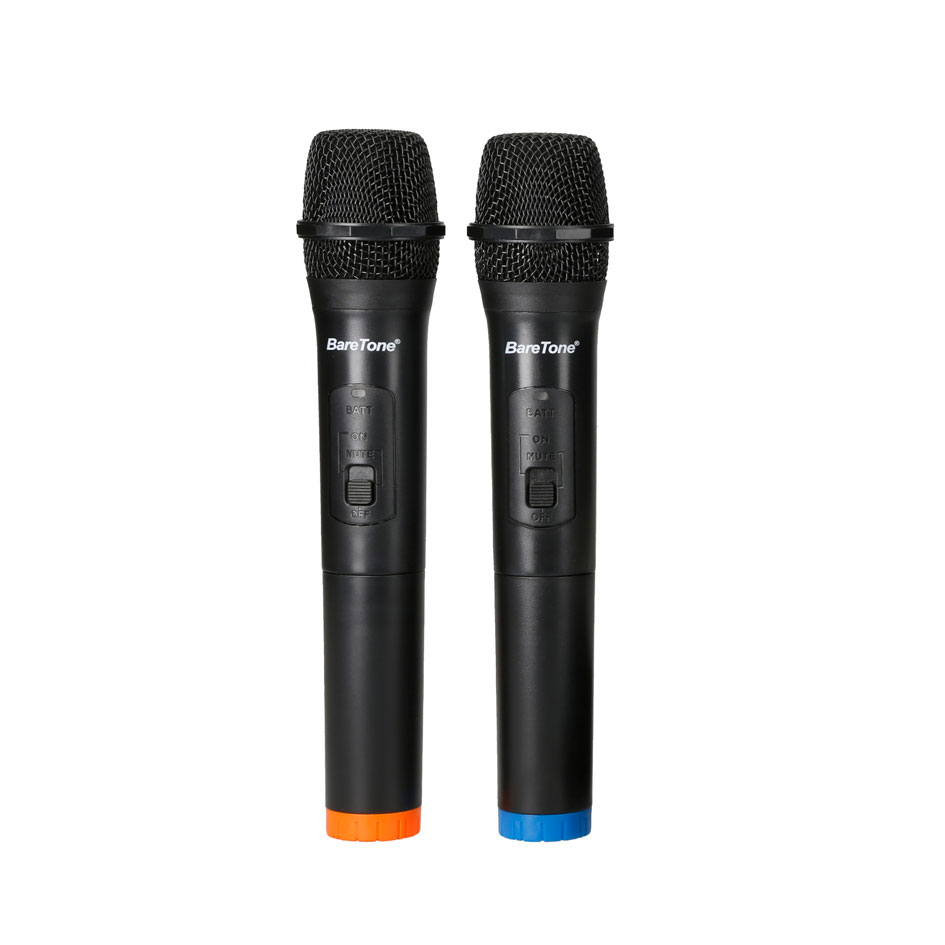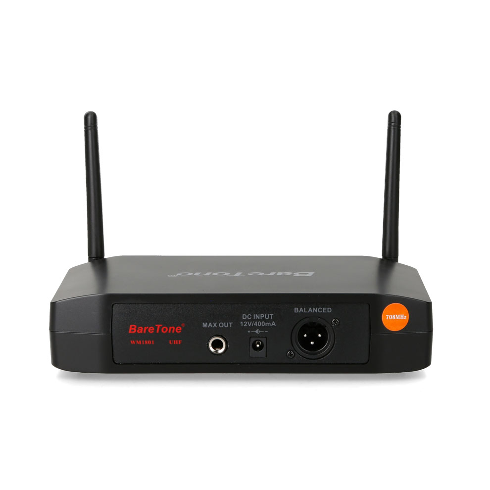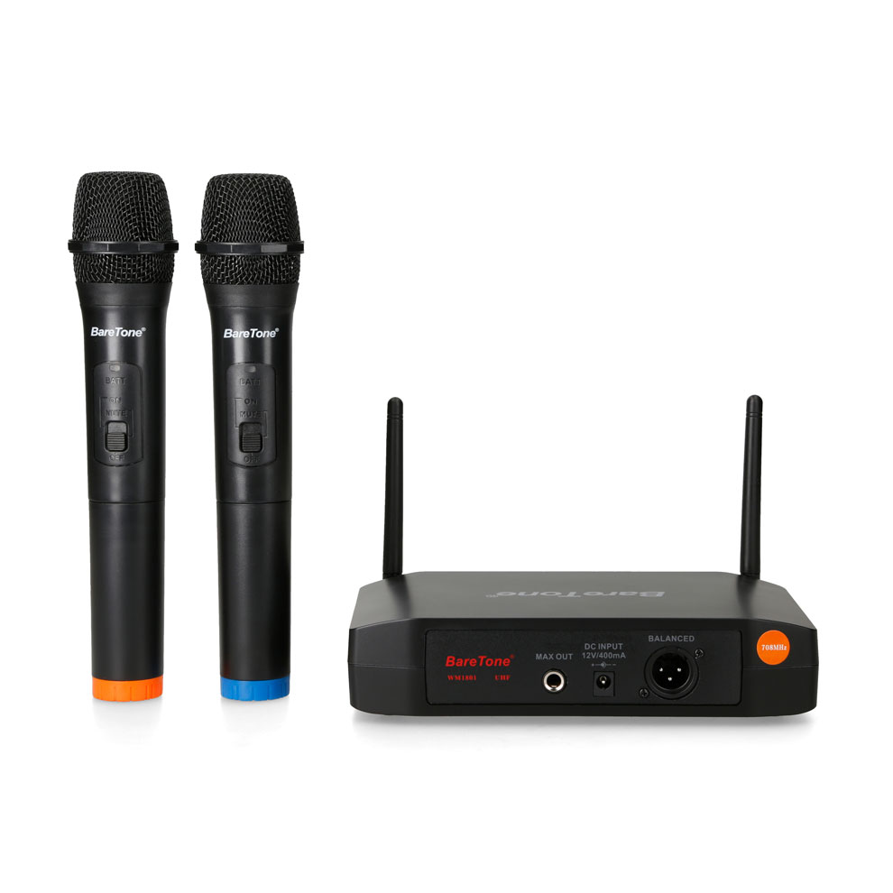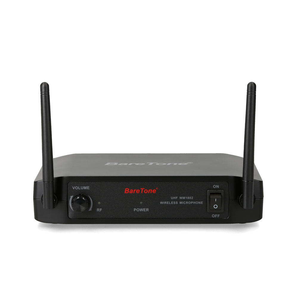 Micrófonos inalámbricos Baretone WM1802. Posee una excelente calidad de audio y nitidez, de frecuencia UHF pensado para su uso en locales de eventos, presentaciones y karaoke para los usuarios más exigentes. Cuenta con una cápsula cardioide dinámica para captar la máxima calidad de sonido antes de la retroalimentación. Conexión a Jack 6.3mm.
